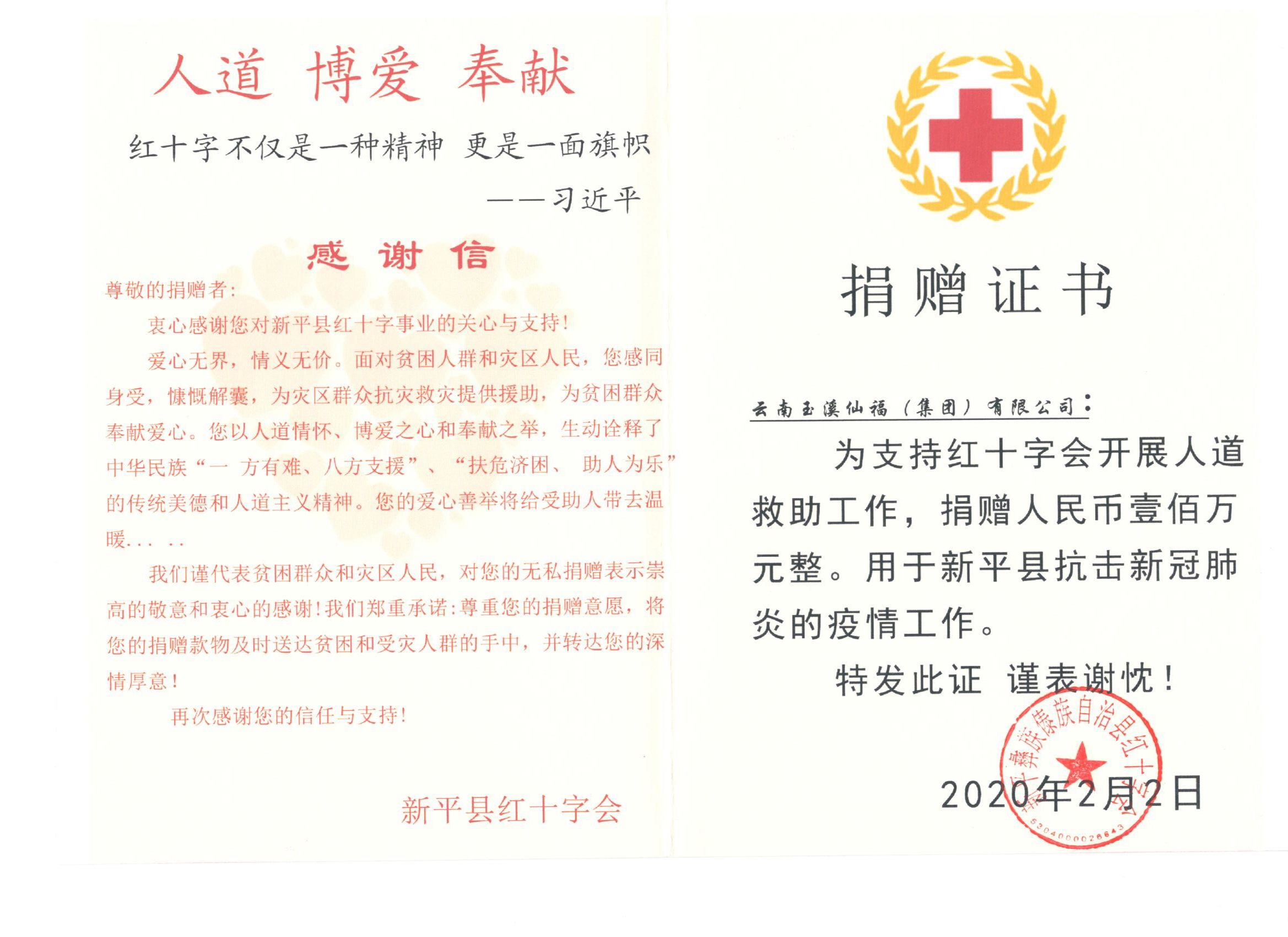 向新平縣紅十字會(huì)捐贈(zèng)人民幣壹佰萬元整